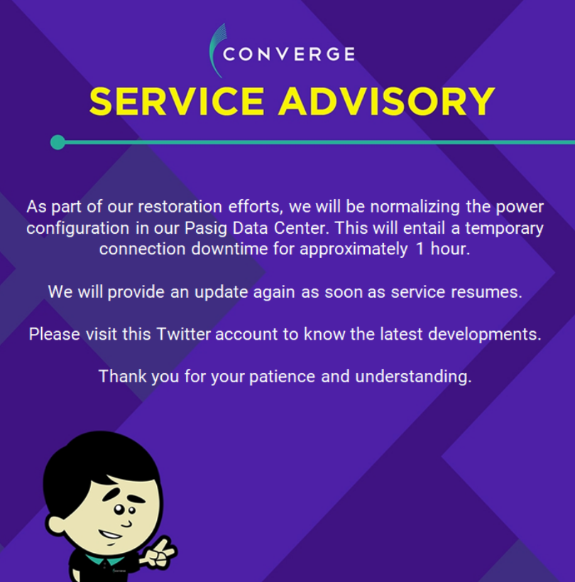 | 05:15 | Converge is still down. Seems to be a massive issue in the Converge Data Centre in Pasig. See tweet from one hour ago below. See also this link : https://downdetector.ph/status/converge/ |