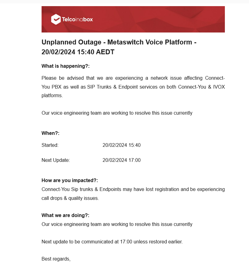 | DESCRIPTION OF INCIDENT | Upstream carrier is experiencing core network connectivity issues effecting all phone services and SIP end points |